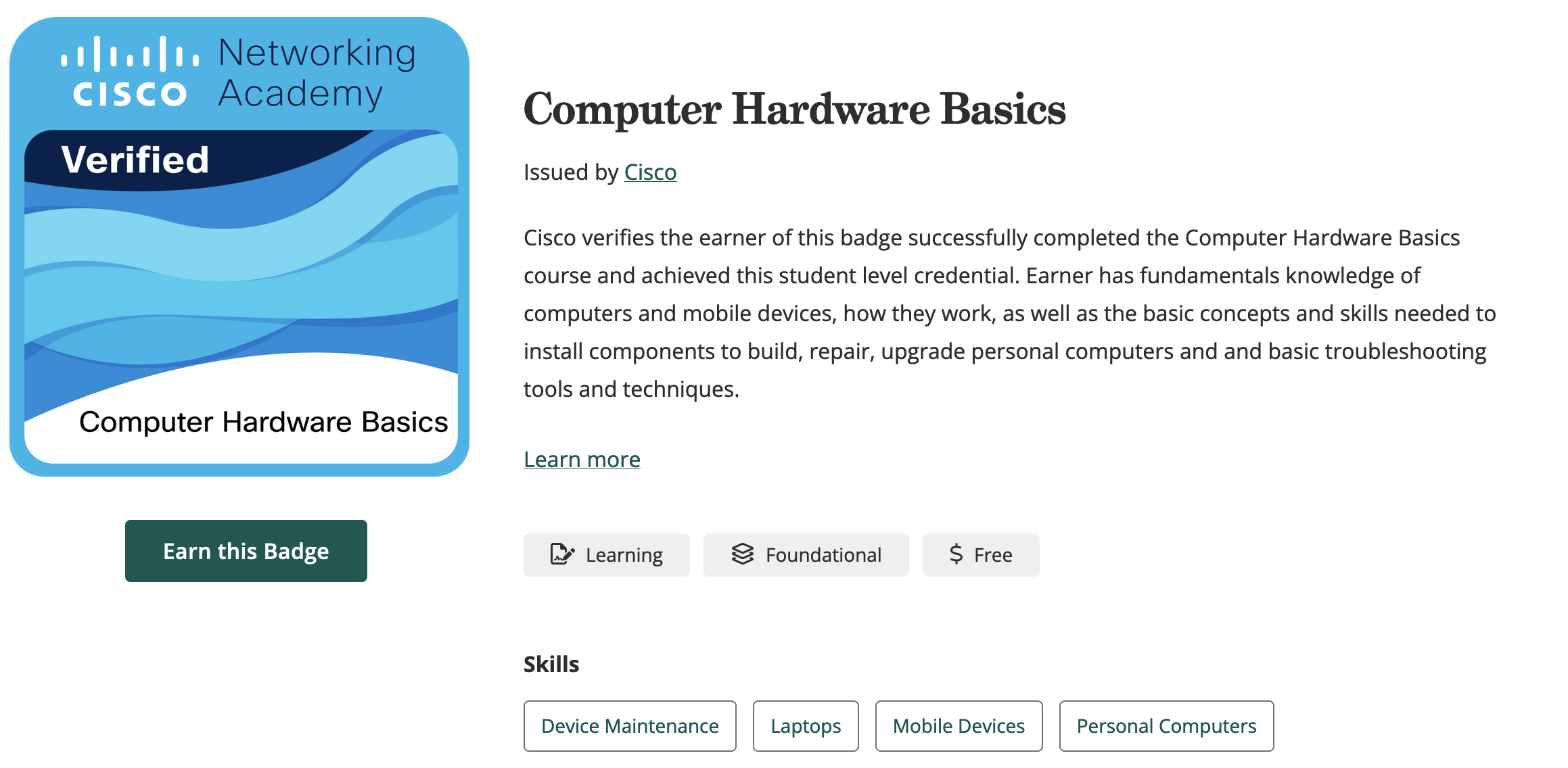 Deuxièmement, j’ai passé la certification “Computer Hardware Basics”. Cette certification m’a permis d’acquérir des connaissances approfondies sur le matériel informatique, notamment comment diagnostiquer une panne matérielle, monter un ordinateur, et comprendre les fonctions des différents composants d’un système informatique.